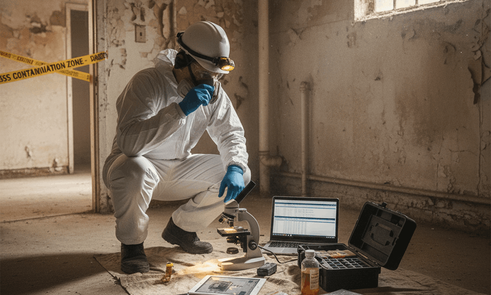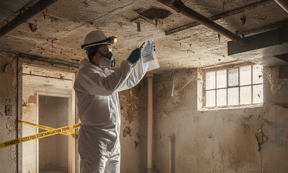 After identifying the location, testing is done to ensure the presence of asbestos. Samples are taken and sent to labs to identify materials containing asbestos.